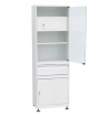 Шкаф одностворчатый для медицинских учреждений. Верхнее дверца стекло, 2 металлические полки, трейзер (внутренний ящик) закрывающийся на ключ. Средняя часть выдвижной ящик на телескопических направляющих. Нижнее отделение металлическая дверца закрывающаяся на ключ. Оснащен регулировочными опорам. Окраска порошковая полимерная.