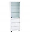 Шкаф одностворчатый для медицинских учреждений. Верхнее отделение дверца стекло, 3 полки стекло. Нижнее отделение 3 ящика на телескопических направляющих. Оснащен регулировочными опорам. Окраска порошковая полимерная.