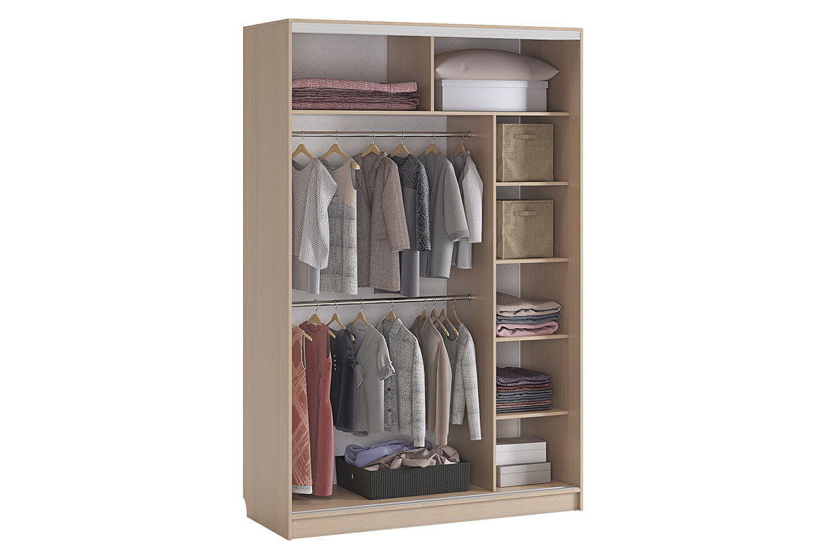 Состоит из отделение со штангами для одежды, полок, верхних отделений для крупногабаритных вещей. Сборка на одну сторону полки справа.Шкаф-купе Гранд это сочетание вместительности и классического дизайна. Он функционален есть отделение со штангами для одежды, полки и верхние отделения для крупногабаритных вещей. В шкафу две штанги для короткой одеждыДвери-купе выполнены с рамочным стальным профилем.Внутреннее наполнение дверей- одна дверь ЛДСП, вторая зеркало c принтом и противоосколочной пленкой.Условия покупки