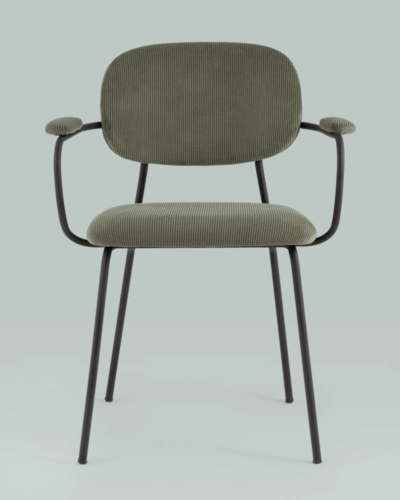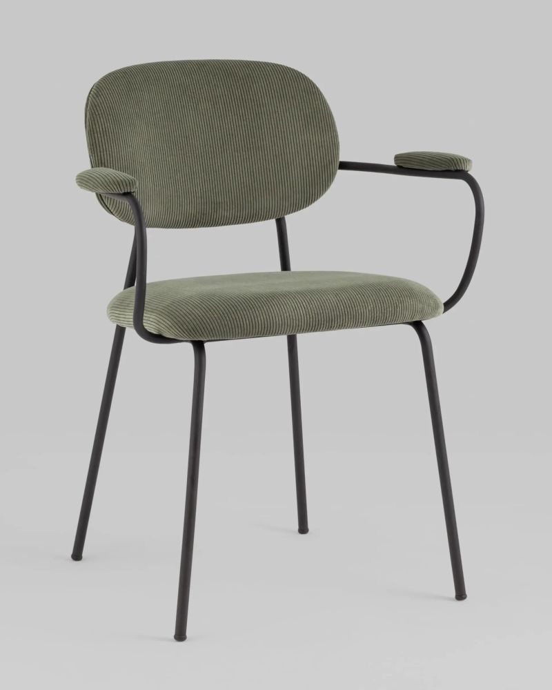 Современный обеденный стул с подлокотниками и металлическими ножками. Обивка выполнена из мягкого велюра. Металлический каркас черного цвета огибает спинку и плавно переходит из подлокотников в ножки. Широкое сиденье обеспечивает удобную посадку и уют. На подлокотниках для дополнительного комфорта предусмотрены мягкие накладки.