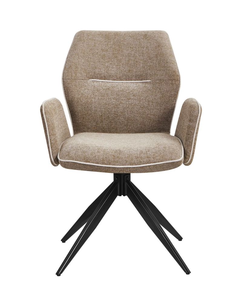 Мягкий стул со спинкой анатомической формы и удобными подлокотниками подарит комфорт и уют. Тканевая обивка оформлена декоративным кантом. Прочные ножки изготовлены из металла в черном цвете, поэтому обеспечивают хорошую устойчивость и делают стул оригинальным. Подпятники на ножках препятствуют скольжению и помогут защитить напольное покрытие от царапин.Изделие будет прекрасно смотреться как отдельный предмет мебели, так и в комплекте с обеденным или письменным столом. Модель стула оборудована поворотно-возвратным механизмом если повернуться на стуле и встать, то сиденье вернется в исходное положение.Условия покупки