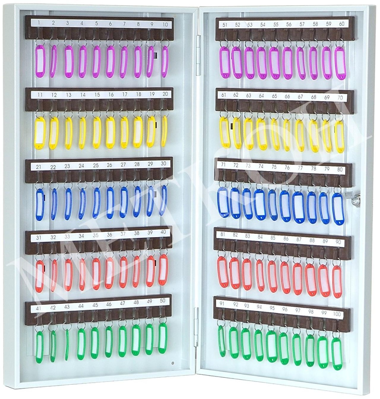 Ключница КЛ-100 предназначена для хранения 100 комплектов ключей. На задней стенке корпуса расположены отверстия для крепления. Ключница комплектуется 10 планками под навеску ключей. В дверь установлен замок типа «Cam-Lock».