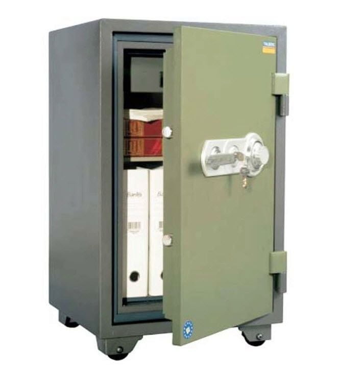 Сейф огнестойкий, производство - Россия, EU. Сертифицирован на класс 60Б (60 минут защиты от пожара) по ГОСТ Р 50862-2005. Корпус сейфа представляет собой двухслойную конструкцию с наполнением. Межстеночное пространство заполнено запатентованным составом огнестойкого бетона. Замок механический кодовый (код фиксированный без возможности смены) и ключевой. По периметру дверной проем проклеен огнестойким уплотнителем. Внутри сейфа трейзер (внутренний ящик с замком) и 1 полка. Комплектуется колесами. Возможно крепление к полу (наличие отверстия в нижней части). Окрашен порошковой краской, цвет: корпус оттенок коричневого с эффектом молотковой эмали, дверь — оттенок зеленого с эффектом молотковой эмали. Гарантия 5 лет.