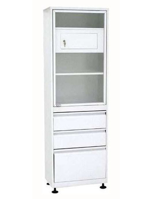 Шкаф одностворчатый для медицинских учреждений. Верхнее дверца стекло обрамленное алюминиевым профилем, 2 металлические полки, трейзер (внутренний ящик) закрывающийся на ключ. Нижнее отделение 3 ящика на телескопических направляющих. Оснащен регулировочными опорам. Окраска порошковая полимерная.
