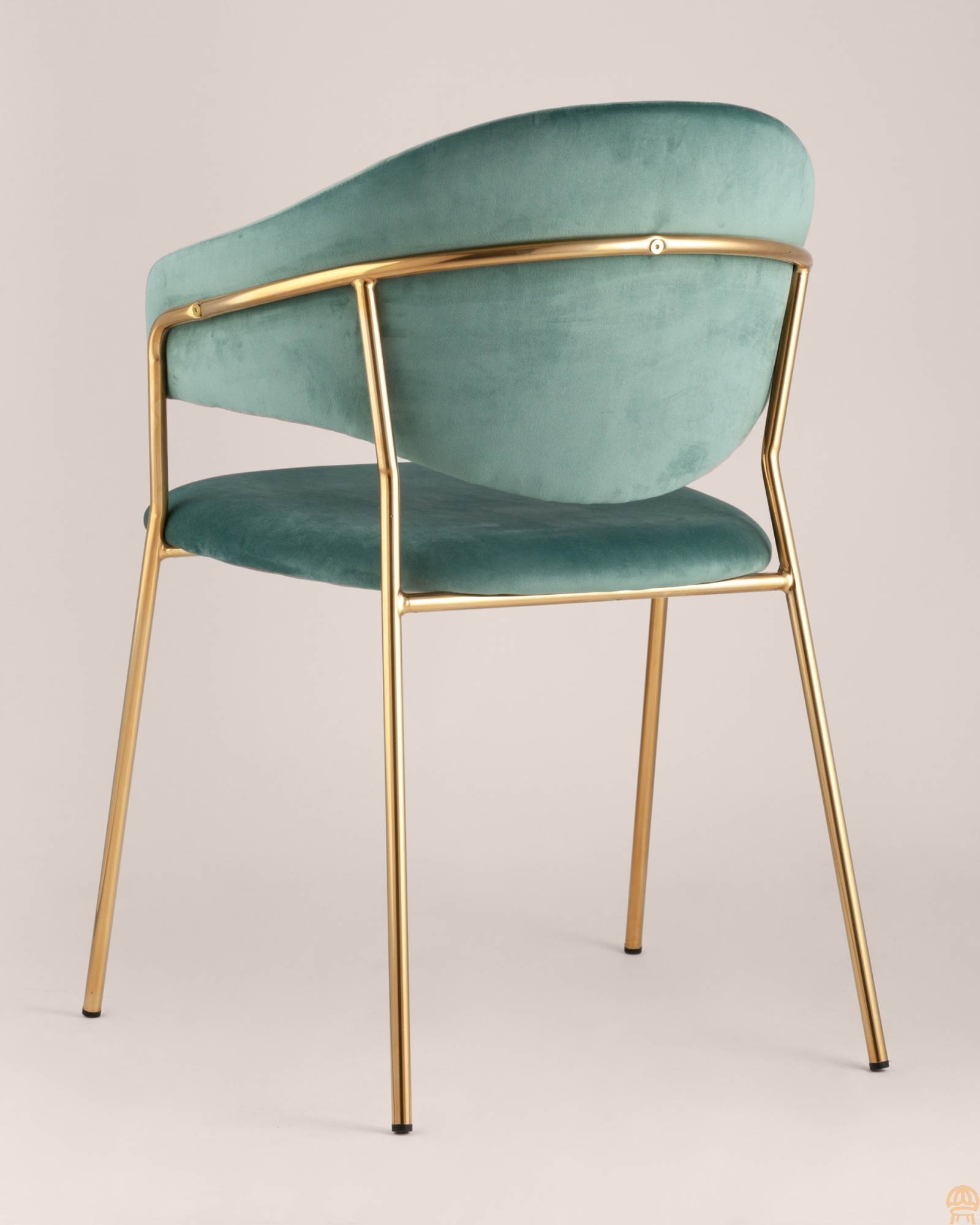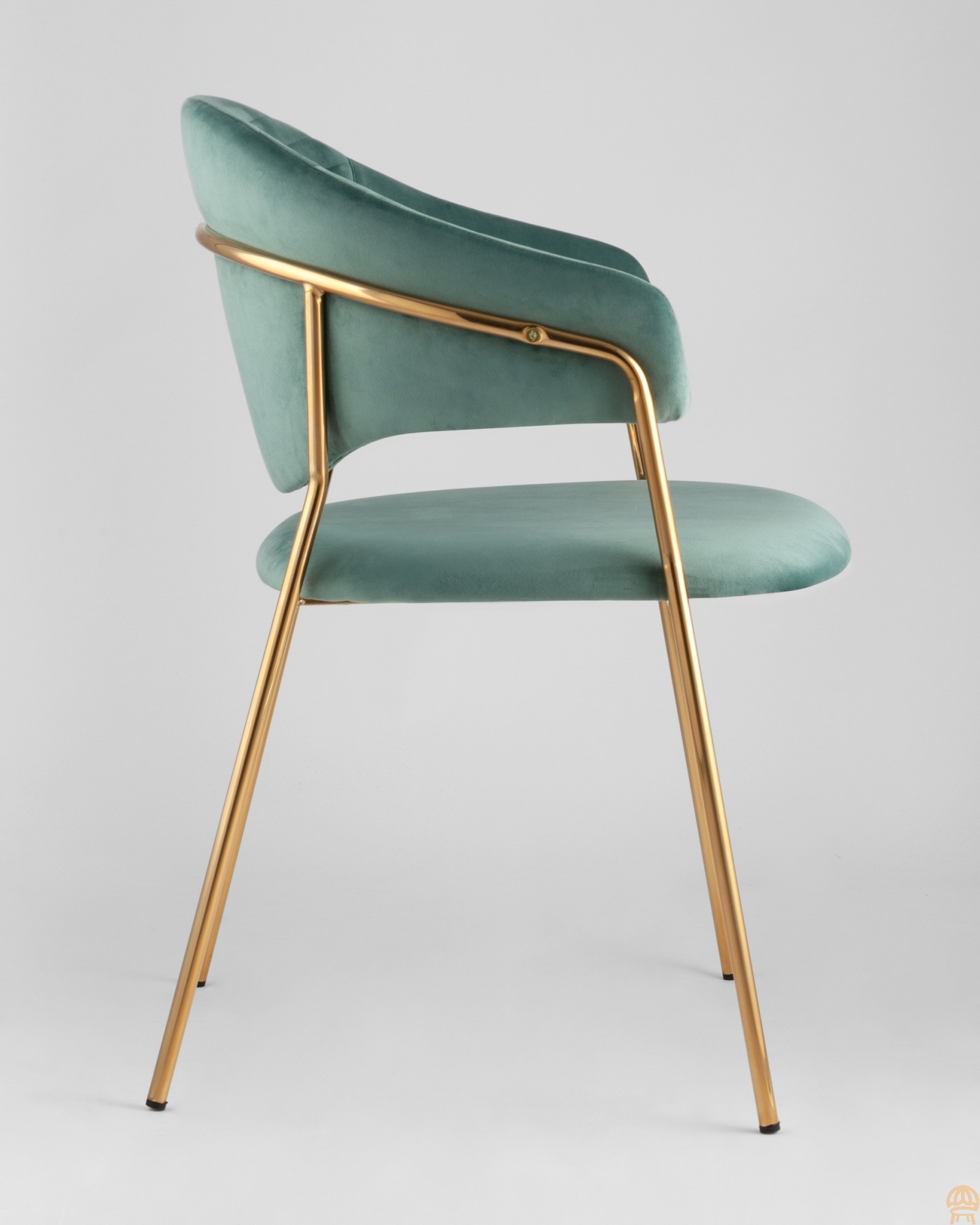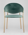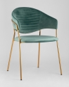 Стильный стул с оригинальной формой спинки, высокой поддержкой и подлокотниками. В качестве обивки используется мягкий велюр. Металлический каркас золотого цвета огибает спинку и выступает аккуратным акцентом модели. Широкое сиденье обеспечивает удобную посадку и уют.Условия покупки