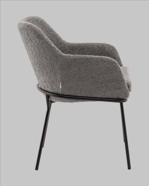 Стул с подлокотникамиКози это сочетание мягких форм и обволакивающего комфорта. Обивка из нежной ткани букле в тёмно-сером цвете добавляет интерьеру уюта и визуального тепла, а округлая форма спинки и подлокотников будто приглашает присесть и расслабиться. Чёрный металлический каркас подчёркивает графичность силуэта и придаёт модели современный акцент. Продуманная эргономикаГлубина посадки 62 см в сочетании с высокой спинкой и подлокотниками создаёт комфортную поддержку для спины и рук. Стул идеально подойдёт для длительного сидения будь то в домашнем кабинете, уютной кофейне или в зале ожидания. Прочная конструкция выдерживает нагрузку до 120 кг, оставаясь при этом лёгкой и элегантной внешне.Условия покупки