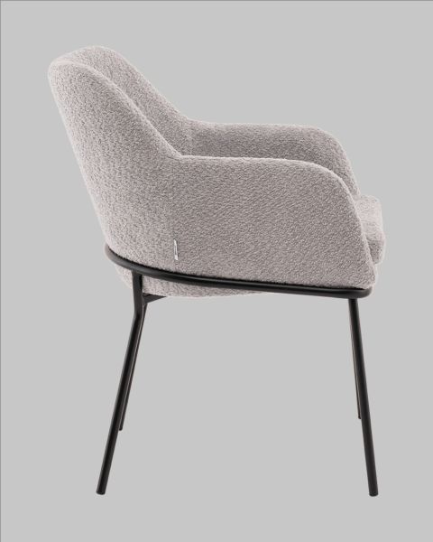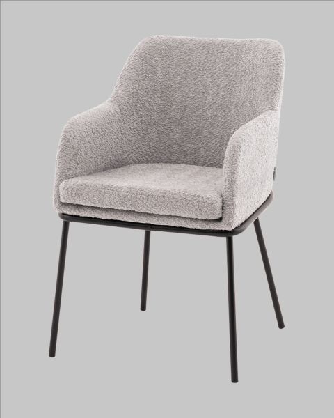 Стул с подлокотникамиКози это сочетание мягких форм и обволакивающего комфорта. Обивка из нежной ткани букле в сером цвете добавляет интерьеру уюта и визуального тепла, а округлая форма спинки и подлокотников будто приглашает присесть и расслабиться. Чёрный металлический каркас подчёркивает графичность силуэта и придаёт модели современный акцент. Продуманная эргономикаГлубина посадки 62 см в сочетании с высокой спинкой и подлокотниками создаёт комфортную поддержку для спины и рук. Стул идеально подойдёт для длительного сидения будь то в домашнем кабинете, уютной кофейне или в зале ожидания. Прочная конструкция выдерживает нагрузку до 120 кг, оставаясь при этом лёгкой и элегантной внешне.Условия покупки