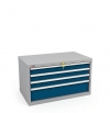 Тумбы окрашены эпоксидной порошковой краской, устойчивой к механическим воздействиям и агрессивным жидкостям: корпус и экран – серые RAL 7038; ящики и двери – темно-синие RAL 250 20 20.; Лоток и Подставка – черный RAL 9005, Аксессуары на экран – серые RAL 7038. Лоток укомплектован резиновым ковриком.